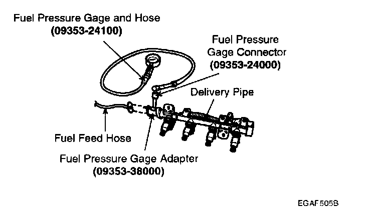 2. Install the Fuel Pressure Gauge Adapter (09353-38000) between the delivery pipe and the fuel feed hose.
