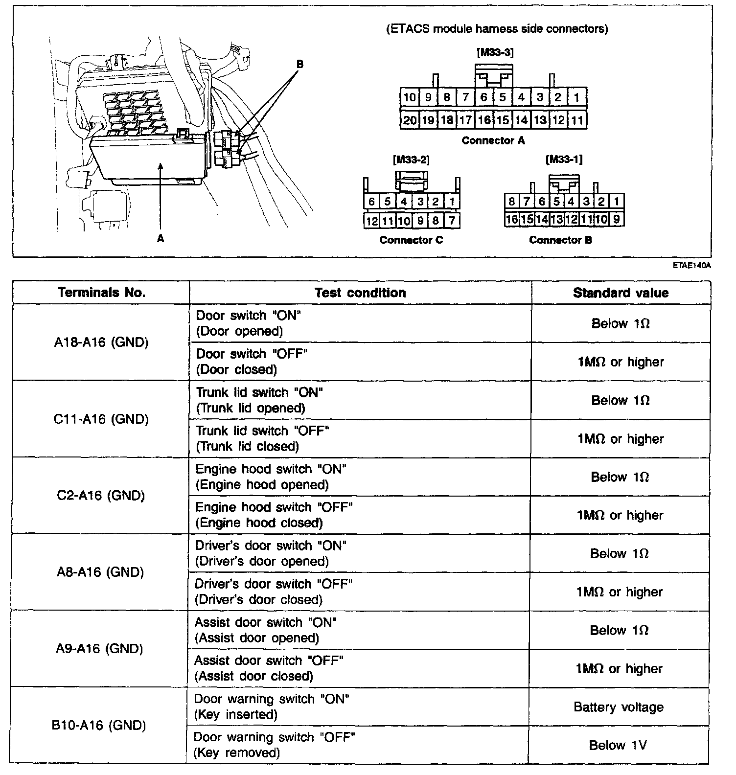 Disconnect the wire connectors(B) from the ETACS module(A).