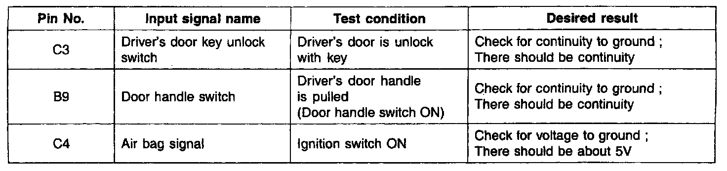 3. If the driver's door unlock switch is OFF to ON, only driver's door unlock output is ON for 0.5 second with burglar alarm system)