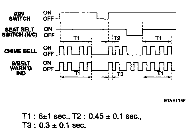 1. Since the ignition is switched ON, the seat belt warning indicator is illuminated (with period: 0.6 sec, duty rate: 50%) and the chime bell is sounded (with period: 0.9 sec., duty rate: 50%) for 6 seconds