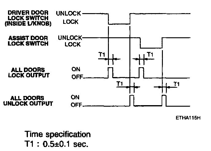 1. If the driver's door lock switch or the assist door lock switch is OFF to ON, the all doors' lock output is ON for 0.5 second