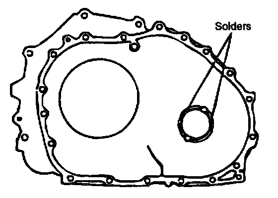 DIFFERENTIAL CASE PRELOAD ADJUSTMENTPlace a solder (approximately 10 mm in length, 3 mm in diameter) on the torque converter housing as shown in the figure. Install the torque converter housing to the transmission case without applying sealant. Tighten its mounting bolts to the specified torque. Loosen the bolts, and remove the solder. Use a micrometer to measure the thickness(T) of the pressed solder. Select a-spare which thickness is within the following value.