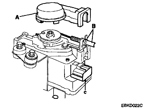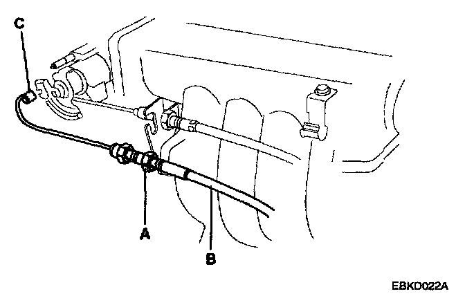 CRUISE CONTROL UNIT AND CABLE1. Loosen the locknuts(A) and disconnect the actuator cable (B) from the throttle linkage(C).
