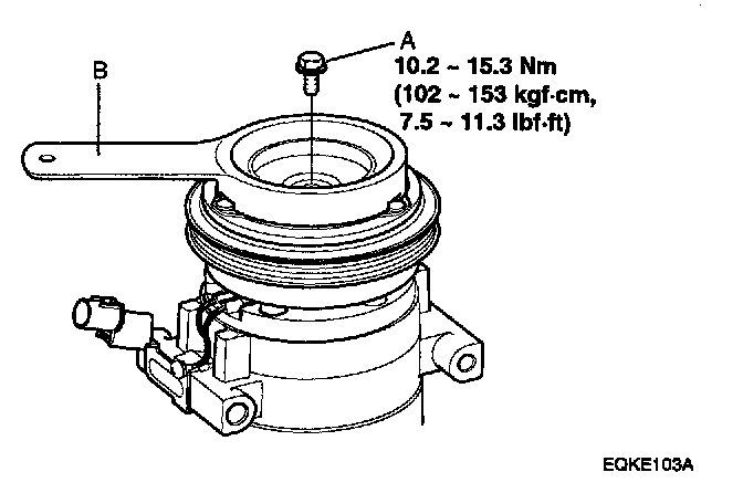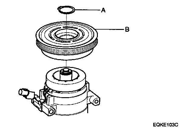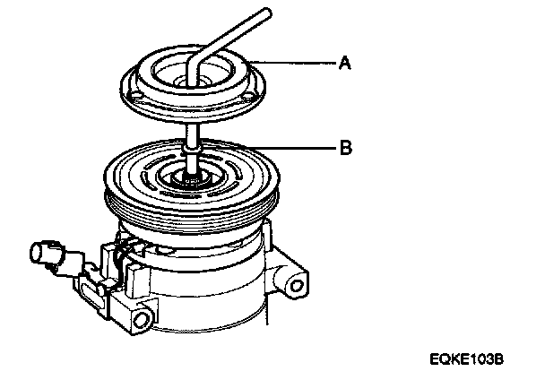 - Be careful not to damage the pulley(B) and compressor during remove/installation.