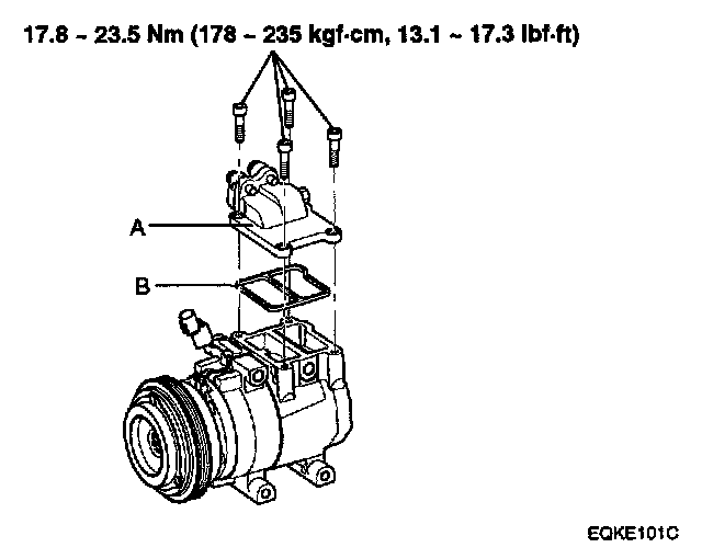 7. Using a hexagon wrench (6 mm) remove the bolts, the manifold assembly(A) and the gasket(B) from the compressor.