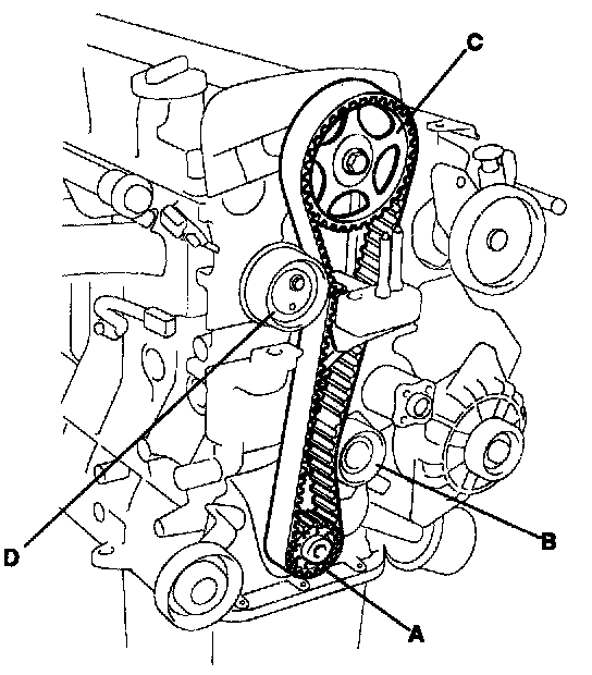 Crankshaft sprocket (A) -> Idler pulley (B) -> Camshaft sprocket (C) -> Timing belt tensioner (D).