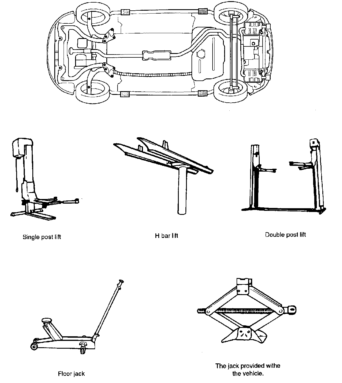 1. Never use a jack beneath the lateral rod or rear suspension assembly.
