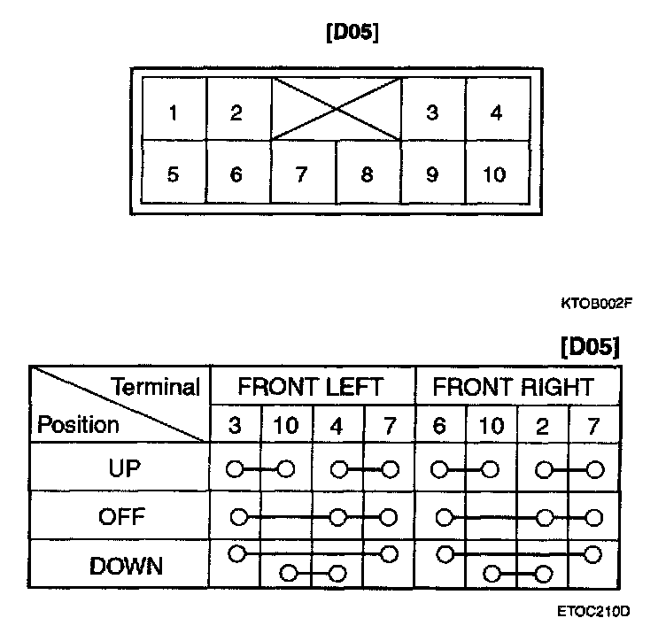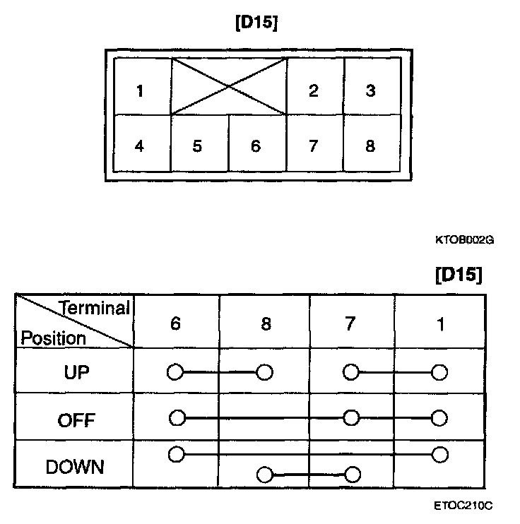 2. Check for continuity between the terminals. If continuity is not as specified in the table, replace the power window switch.