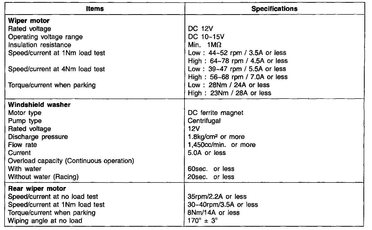 Wiper and Washer Systems: Specifications