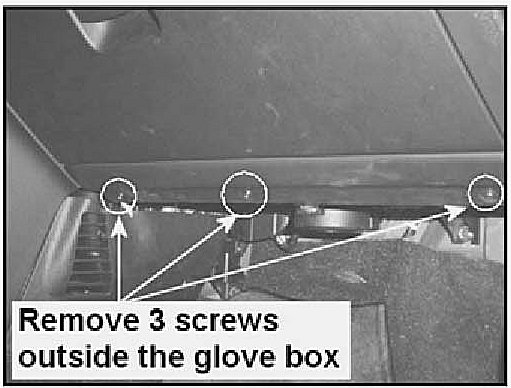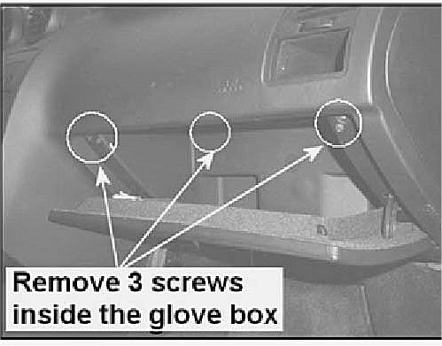 4. (Tiburon only) (skip to Step 7 for Elantra). Remove 3 mounting screws at the outside bottom of the glove box.