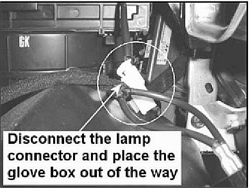 Disconnect the lamp connector at the right rear of the housing. Set the glove box out of the way.