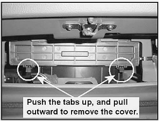 7. Push up and simultaneously pull towards you the two (2) filter cover tabs. The lower edge will pop out, slide the cover down to separate the cover from the three upper retaining slots.