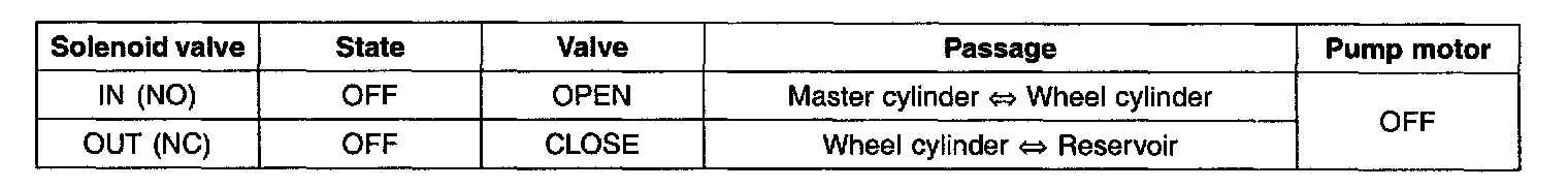 If HECU determines there's no lock-up in the wheel, HECU cuts voltage to solenoid valve. So voltage is not supplied to each solenoid valve, brake fluid passes through the inlet valve to wheel cylinder, resulting in pressure increase.