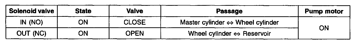 Under the normal braking, voltage is not supplied to solenoid valve, inlet valve is opened and outlet valve is closed. When the brake is depressed, brake fluid is supplied to the wheel cylinder via solenoid valve to activate the brake. When the brake is released, brake fluid is back to the master cylinder via inlet valve and check valve.