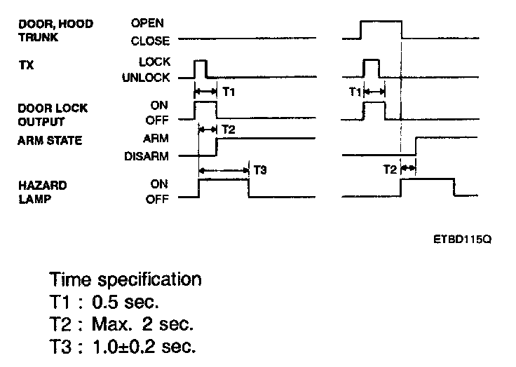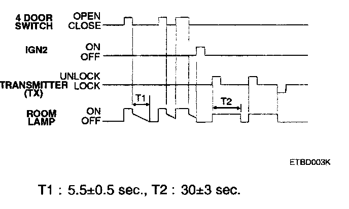 5. With keyless UNLOCK. when the door is closed, the room lamp is turned ON, then OFF after about 30 seconds While the room lamp is ON due to keyless UNLOCK, if another UNLOCK is received, the room lamp is again ON for 30 seconds