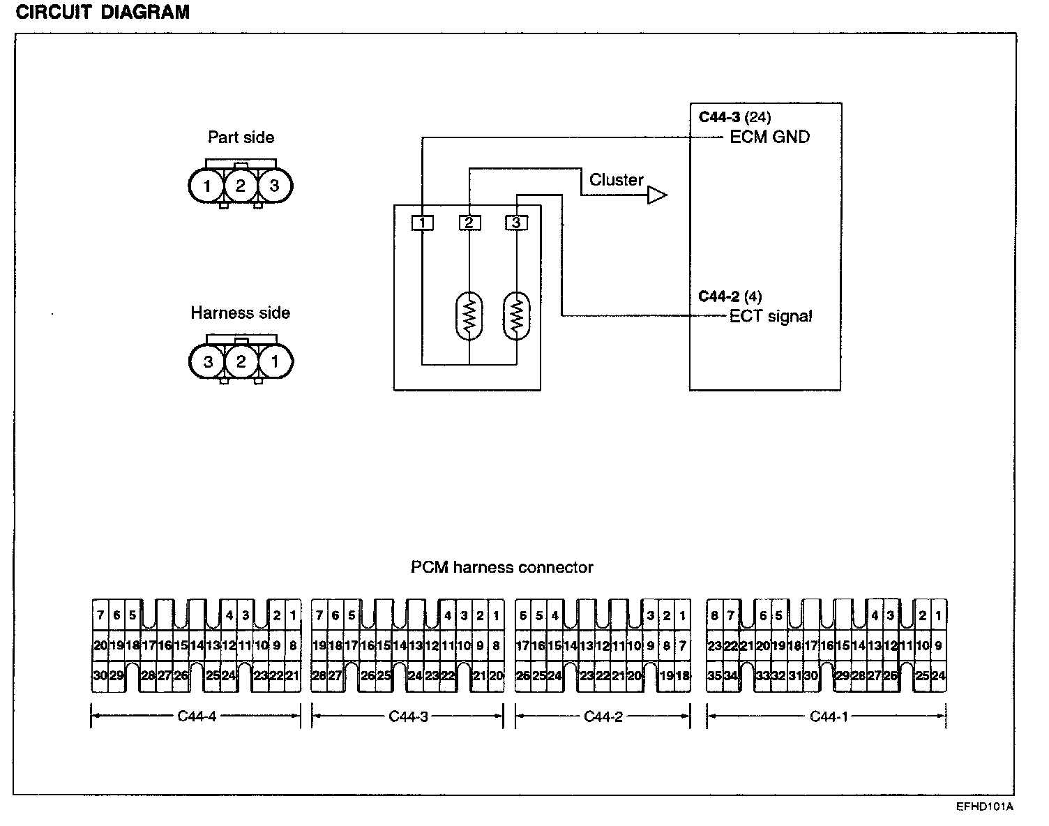 The engine coolant temperature sensor installed in the engine coolant passage of the cylinder head detects the engine coolant temperature and emits signals to the PCM. This part employs a thermistor which is sensitive to changes in temperature. The electric resistance of the thermistor decreases in response to a temperature rise (NTC). The PCM determines engine coolant temperature by the sensor output voltage and provides optimum fuel enrichment when the engine is cold.