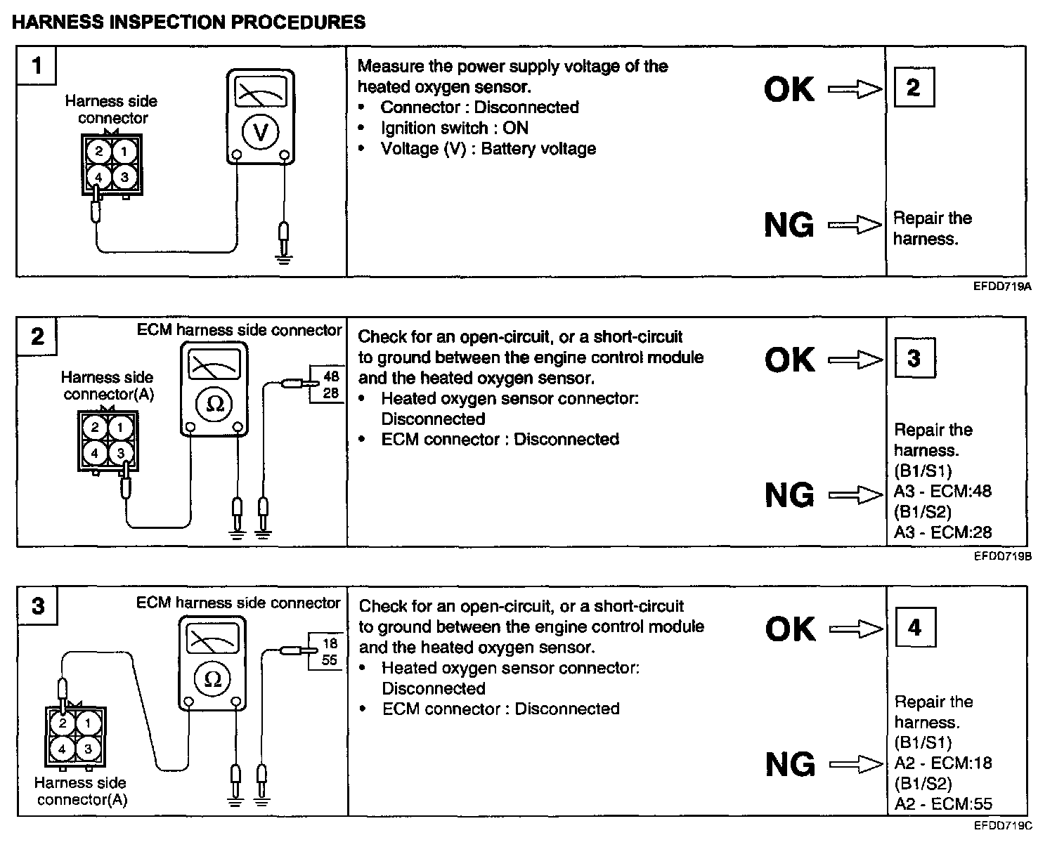 The heated oxygen sensor senses the oxygen concentration in the exhaust gas, then convents it into a voltage and then sends this to the ECM. The heated oxygen sensor gives an output of about 800 mV when the air fuel ratio is richer than the theoretical ratio and output of about 100mV when the ratio is leaner (higher oxygen concentration in exhaust gas.) The ECM controls fuel injection based on this signal so that the air fuel ratio is maintained at the theoretical ratio.