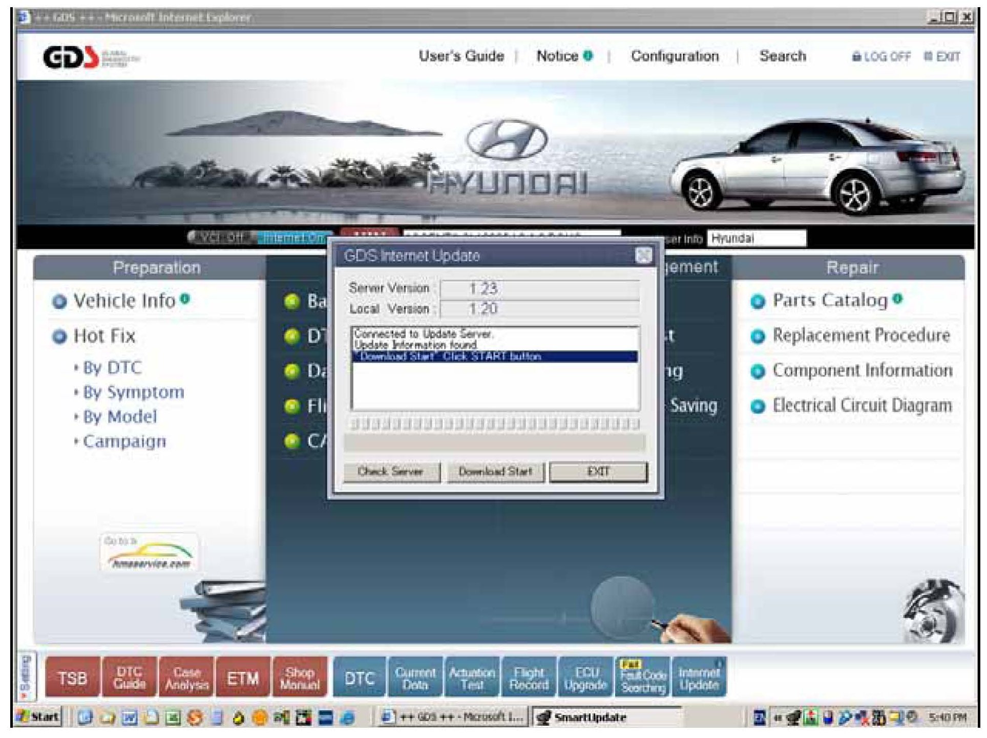 Select the Internet Update to check that your GDS has Local Version 1.23 or higher. Shown is an example of an Internet Update available to Server Version 1.23 with the current GDS Local Version at 1.20, note the Download Start button is available to perform the internet update: