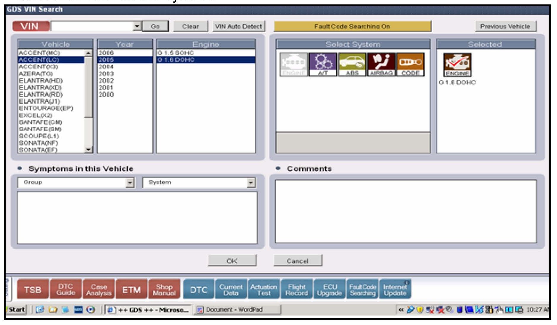 1. Enter the vehicle information either automatically by pressing the VIN Auto Detect button or if it does not work then enter manually the vehicle model, model year, and select ENGINE as the system.