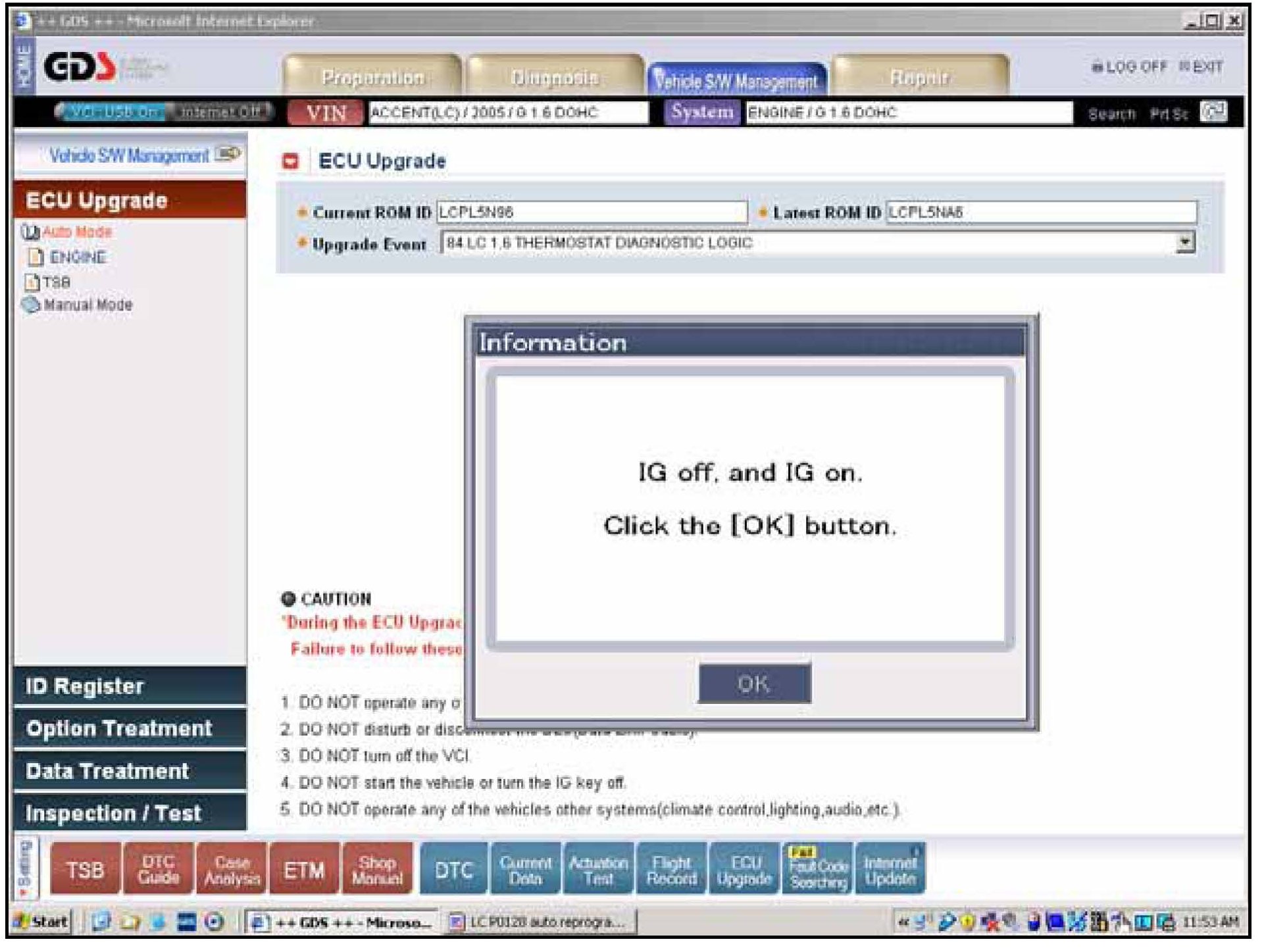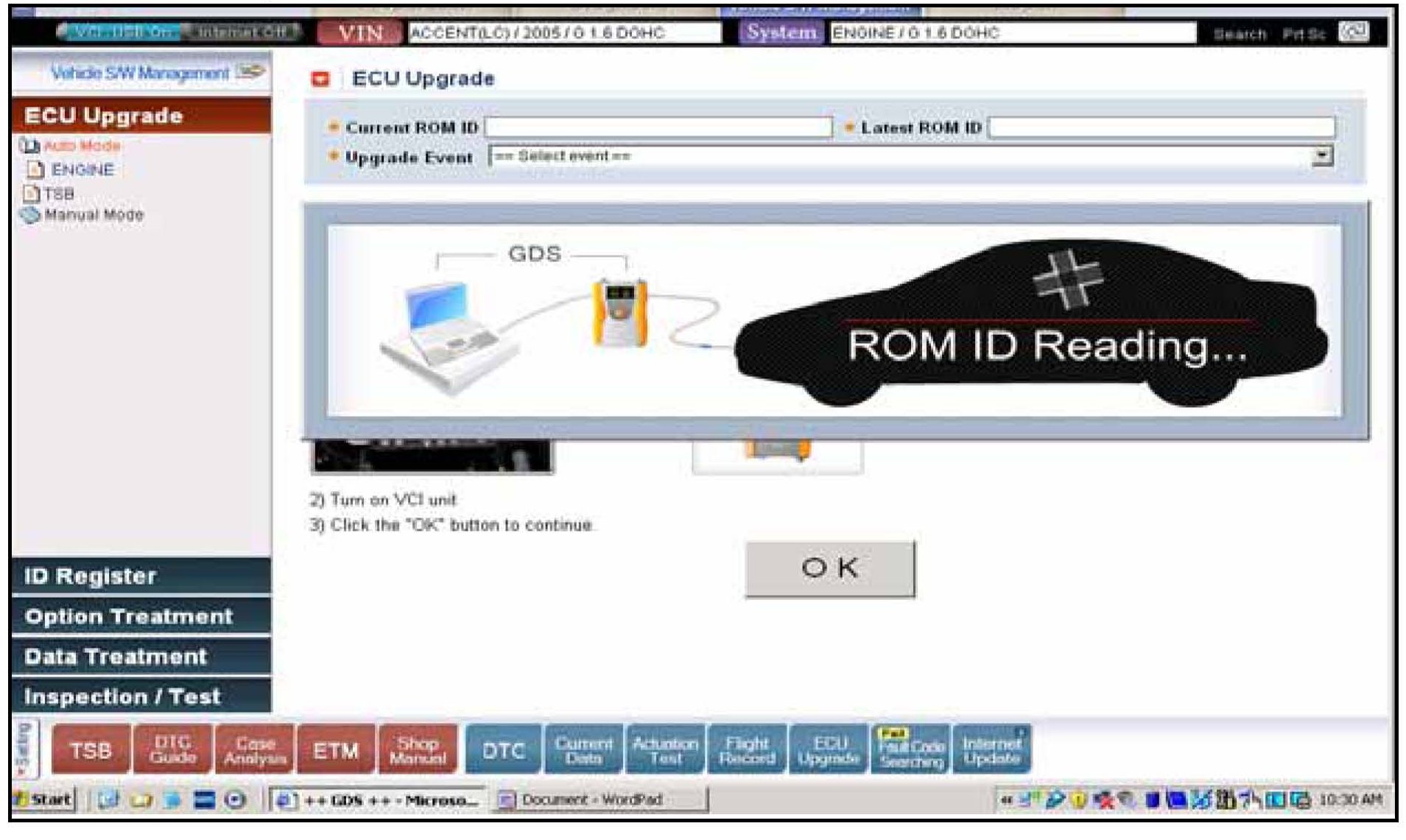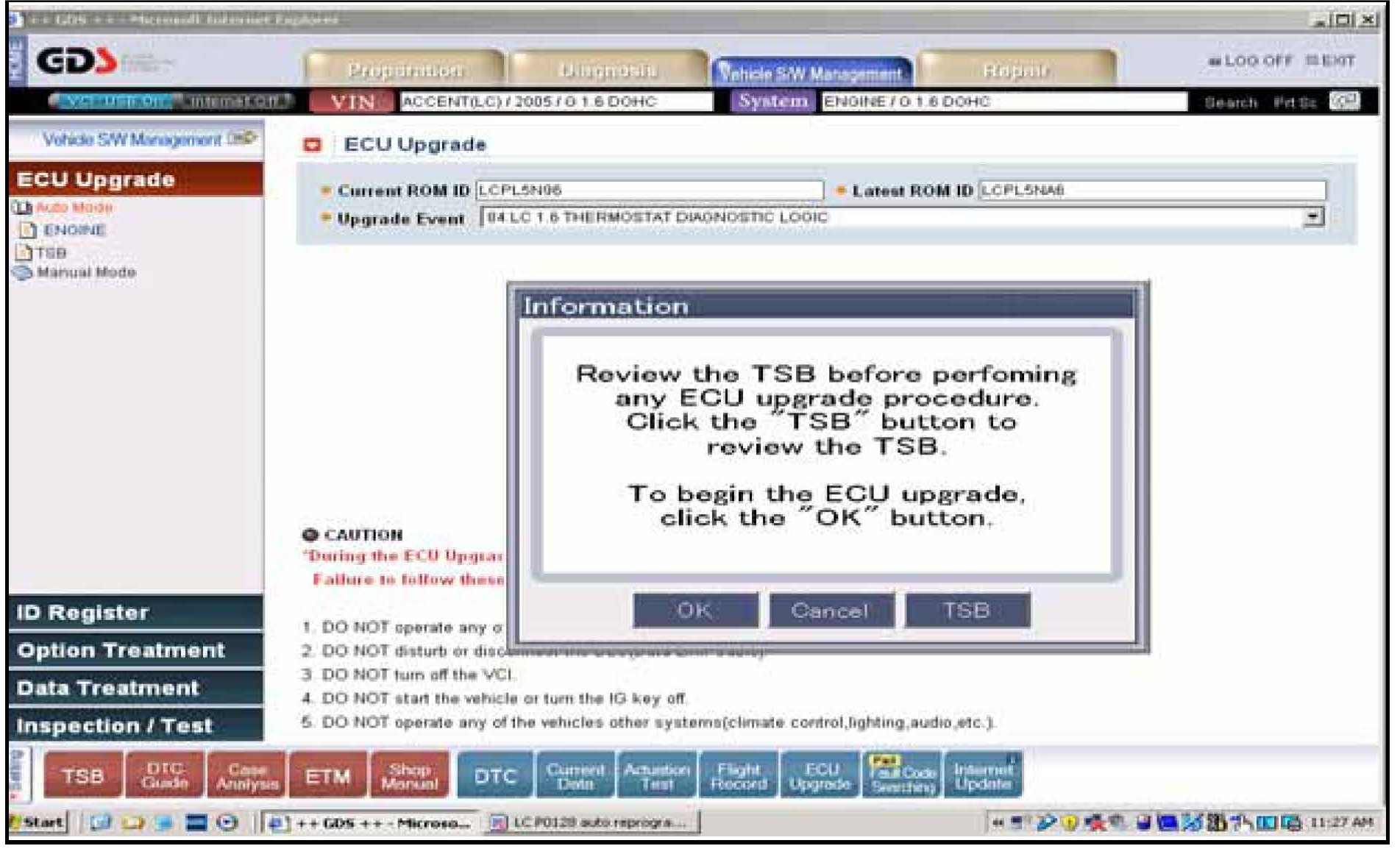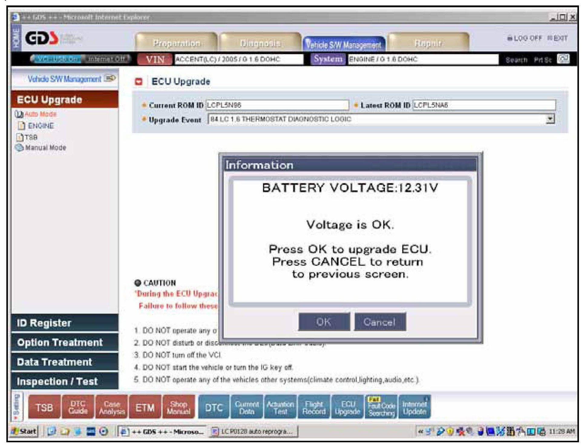 If voltage is below 12 volts then click on Cancel; run the engine for 10 minutes at idle and click on OK again at the previous screen to check that battery voltage then exceeds 12 volts.