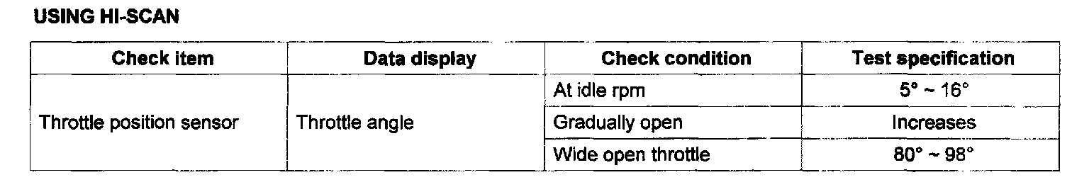 2. If the idle condition or acceleration is abnormal, check the TPS connector. (When the TPS connector is not connected properly, the current data on HI-SCAN can show that the idle state remains oft, although the accelerator pedal is released. This results in the improper idle or acceleration.)