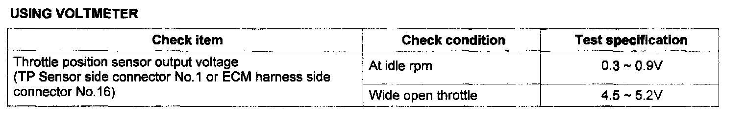 3. Input voltage from throttle position sensor is below 0.1V or above 4.7 V when ignition switch is turned on.
