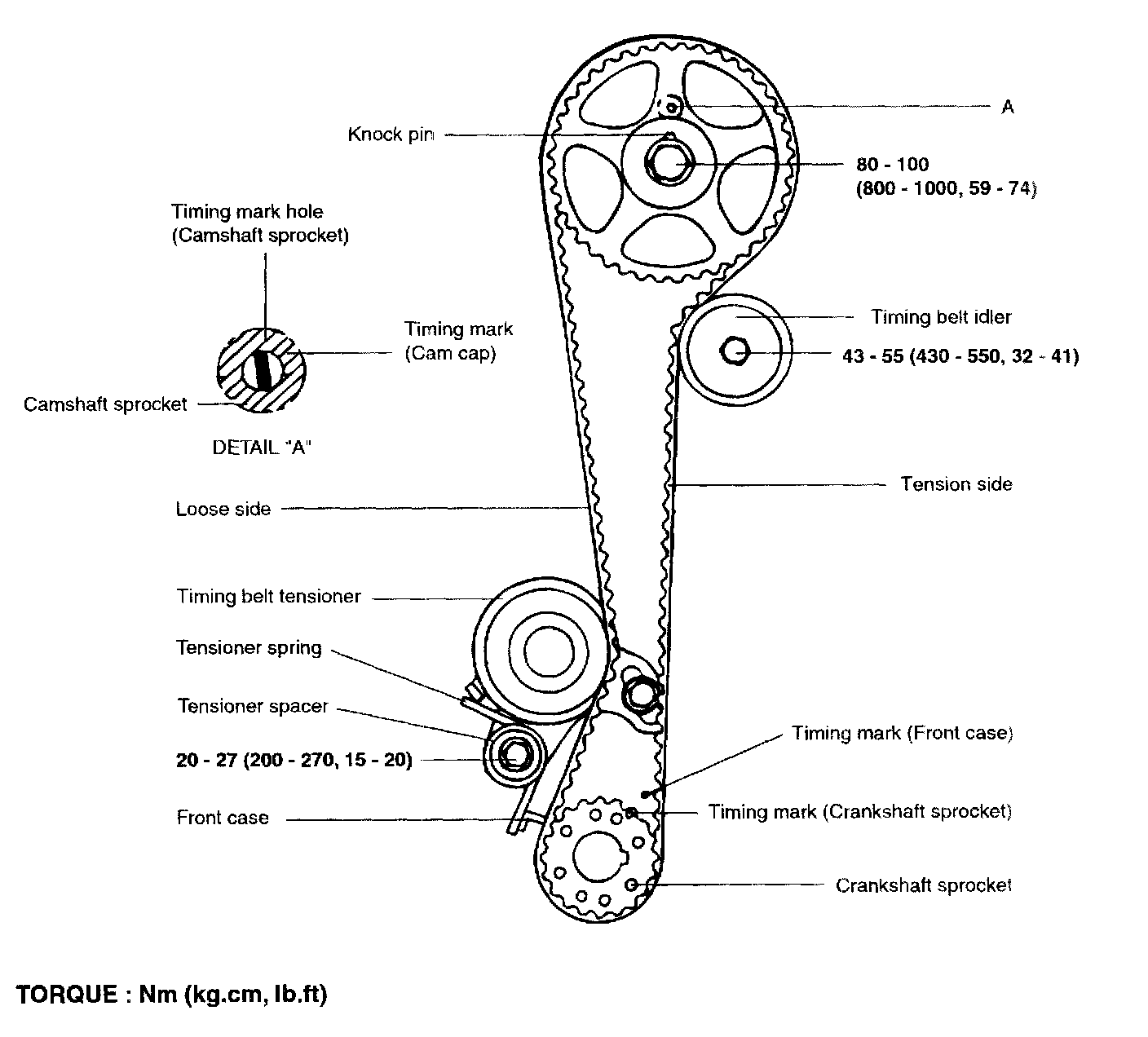 Timing belt tensioner bolt 20-27 Nm (200-270 kg-cm, 15-20 ft. lbs.)