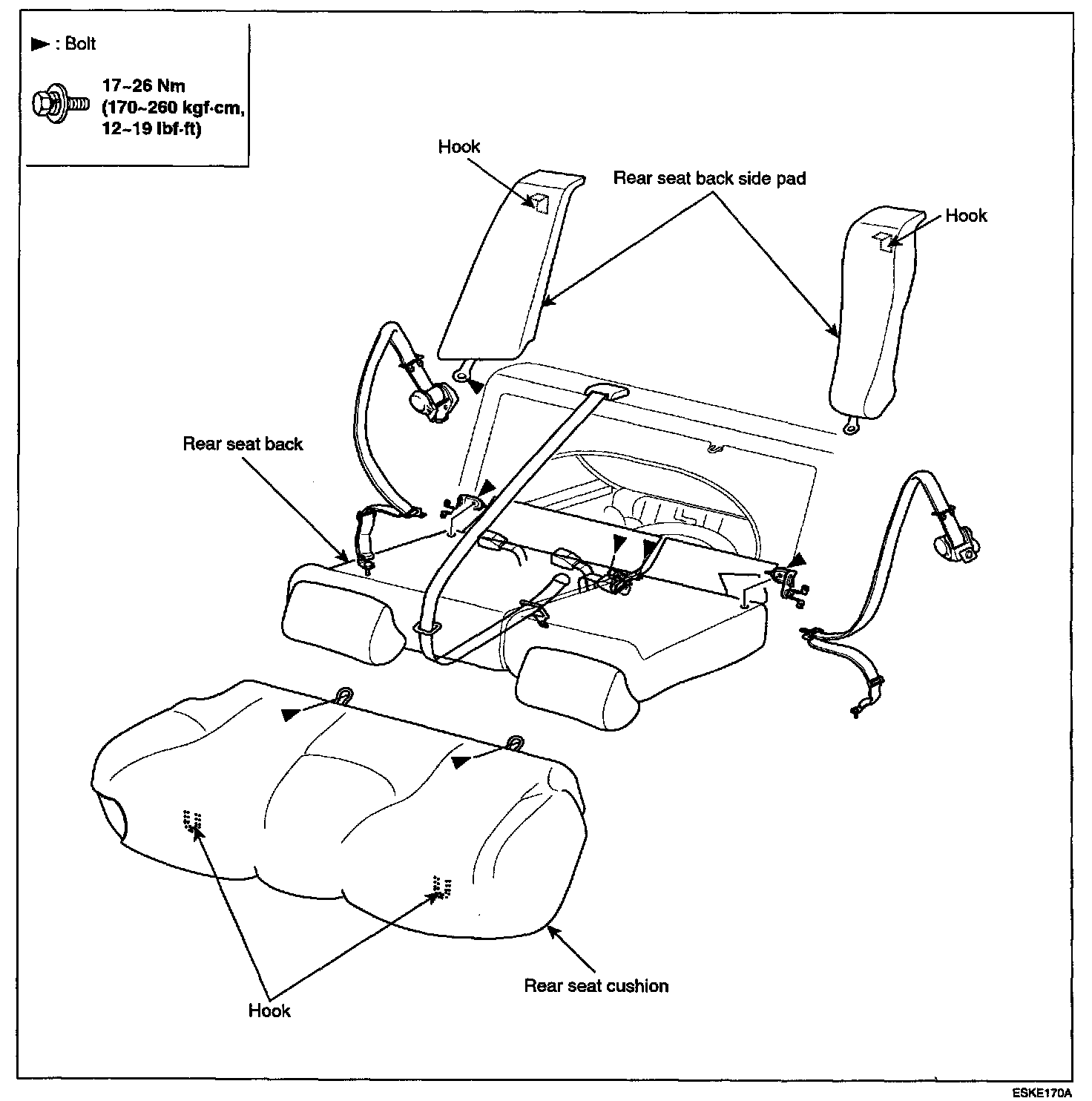 - Before attaching the rear seat-back and cushion, make sure there are no twists or kinks in the rear seat belts and center belt.