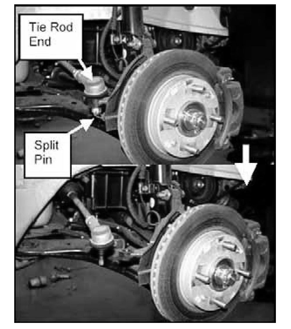 7. Remove the split pins and nuts from the outer tie rod ends. Disconnect the tie rod from the steering knuckle using Special Tool 09568-34000.
