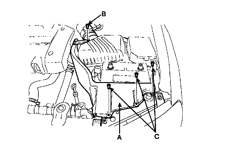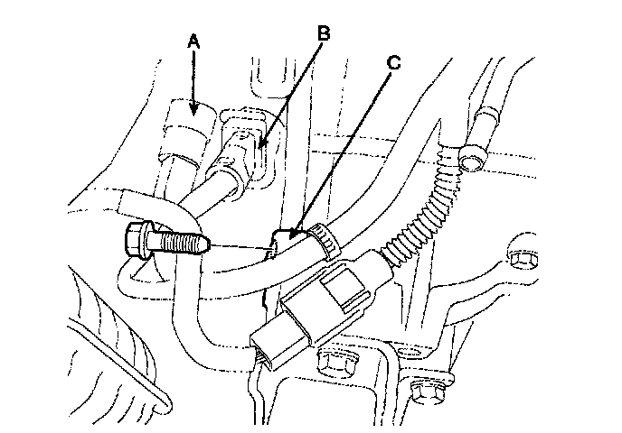 19. Remove front oxygen sensor, engine oil pressure switch (A), crank position sensor (B) connector mounting bracket (C).