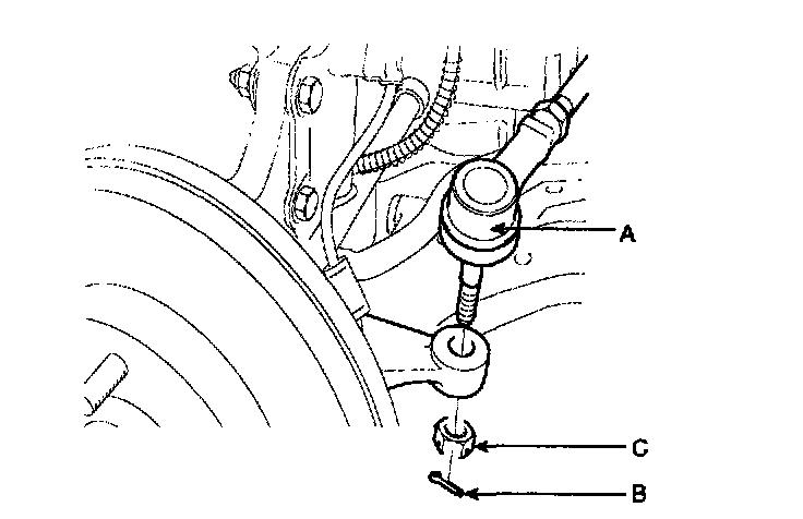 24. Separate the tie rod end (A) from the pin (B) and nut (C).
