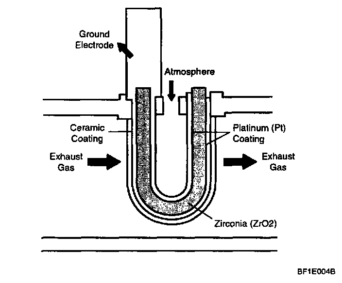 The heated oxygen sensor (HO2S) senses the oxygen concentration in exhaust gas and converts it into a voltage that is sent to the ECM. For Zirconium type sensors, the oxygen sensor outputs about 1 V when the air fuel ratio is richer than the theoretical ratio, and outputs about 0 V when the ratio is leaner (higher oxygen concentration in exhaust gas). The ECM controls the fuel injection ratio based on this signal so that the air fuel ratio is maintained at the stoichiometric ratio. The oxygen sensor has a heating element that ensures sensor performance during all driving conditions.