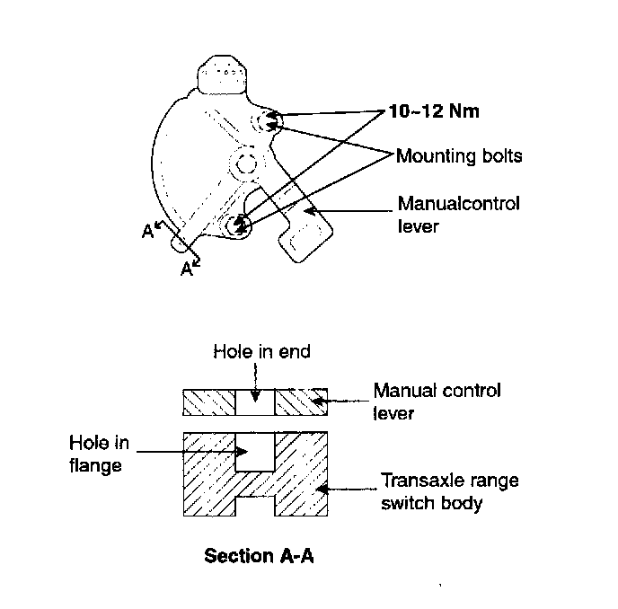 4. Loosen the transaxle range switch body mounting bolts and then turn the transaxle range switch body so the hole in the end of the manual control lever and the hole (cross section A-A in the figure) in the flange of the transaxle range switch body flange are aligned.