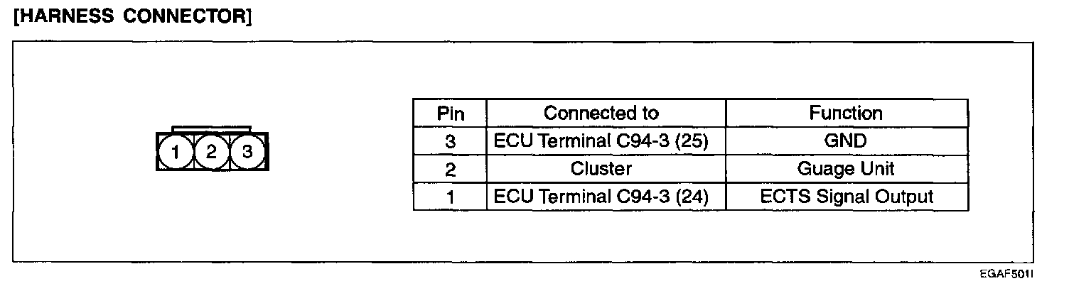 Engine Coolant Temperature Sensor (ECTS) installed in the engine coolant passage of the cylinder head detects the engine coolant temperature and emits signals to the ECM. This part employs a thermistor which is sensitive to changes in temperature. The electric resistance of the thermistor decreases in response to a temperature rise (NTC). The ECM determines engine coolant temperature by the sensor output voltage and provides optimum fuel enrichment when the engine is cold.