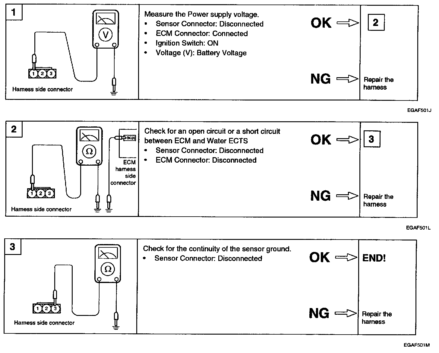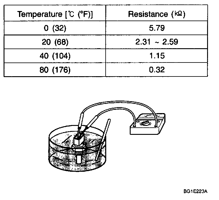 2. With the temperature sensing portion of ECTS immersed in hot engine coolant, check the resistance.