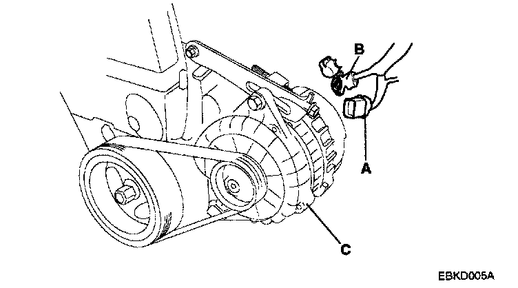 2. Disconnect the generator connector(A) and "B" terminal cable(B) from the generator(C).
