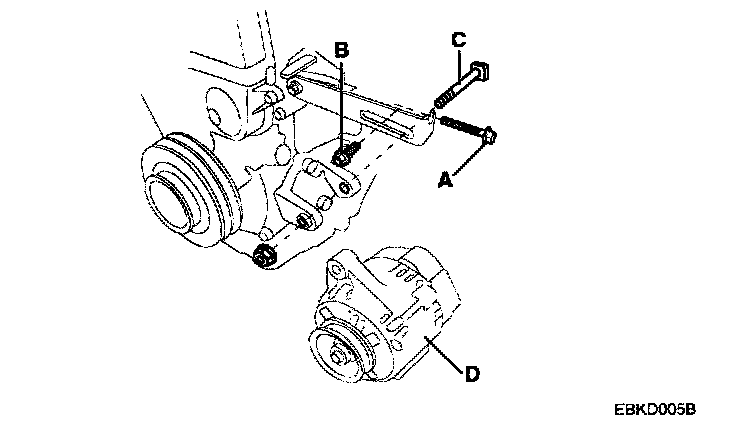3. Remove the adjusting bolt(A) and mounting bolt(B), then remove the generator belt(C).