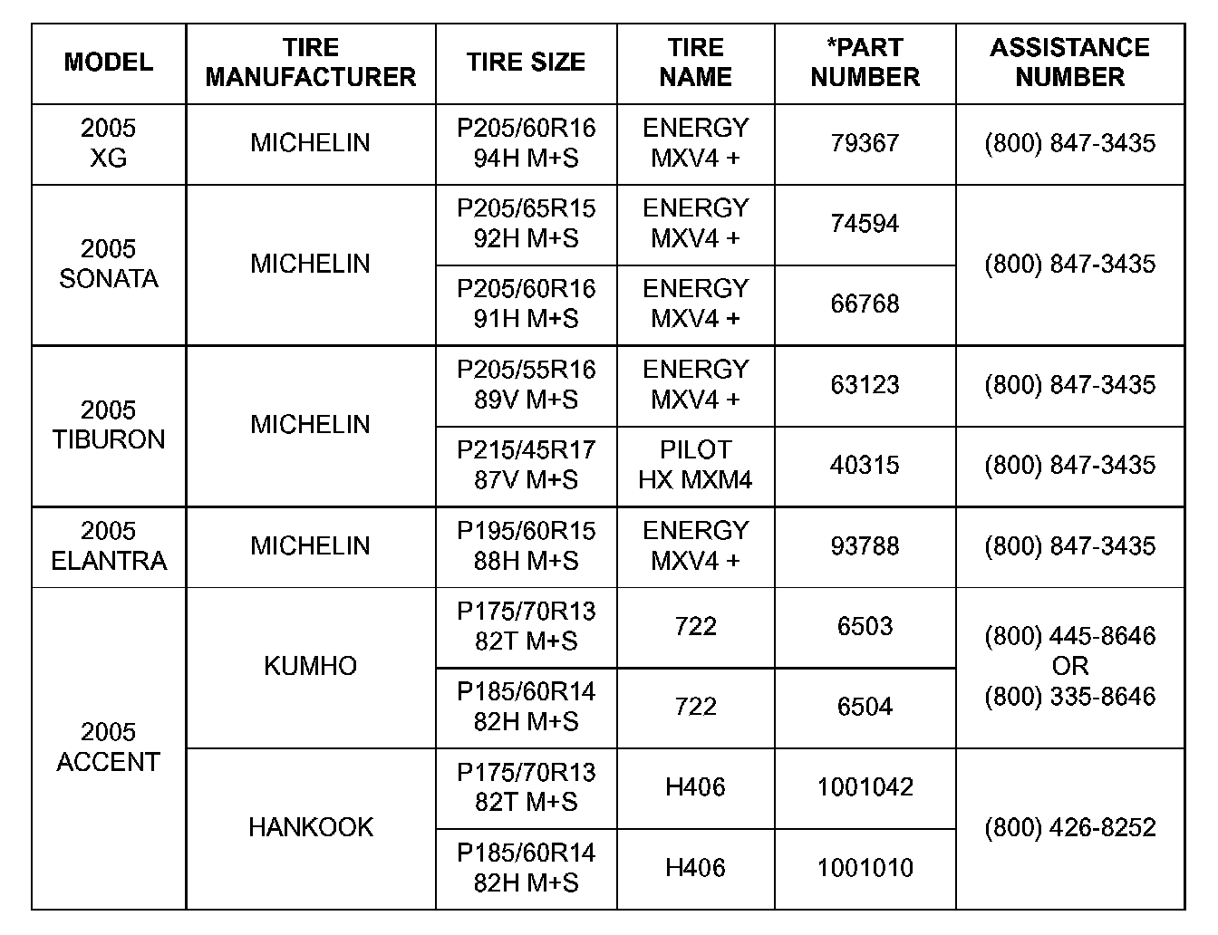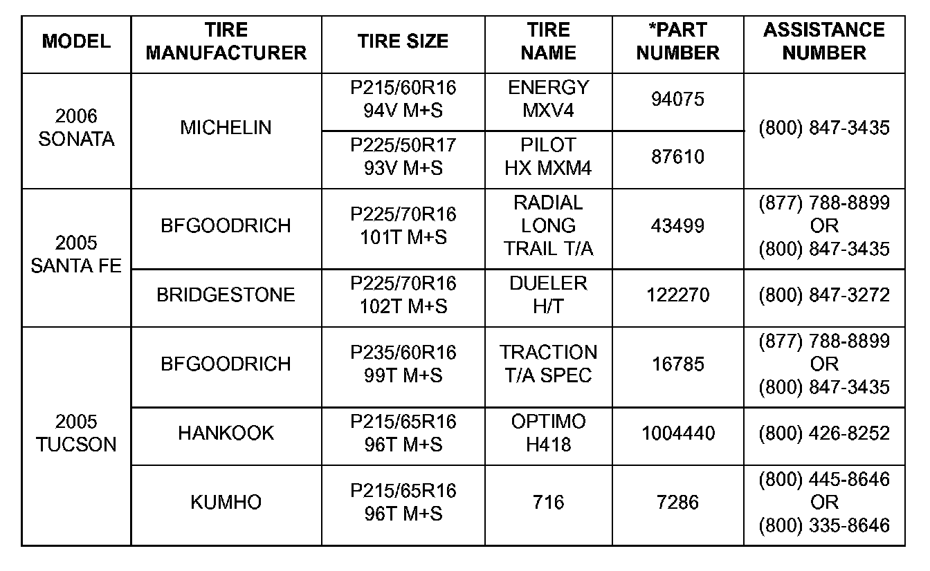2005 and 2006 MY Hyundai vehicles are equipped with tires produced by the following five tire manufacturers: Michelin, BF Goodrich, Bridgestone, Hankook and Kumho. Should you have a question regarding tire service or replacement, please contact the appropriate tire manufacturer for assistance with the tire part number information provided below.