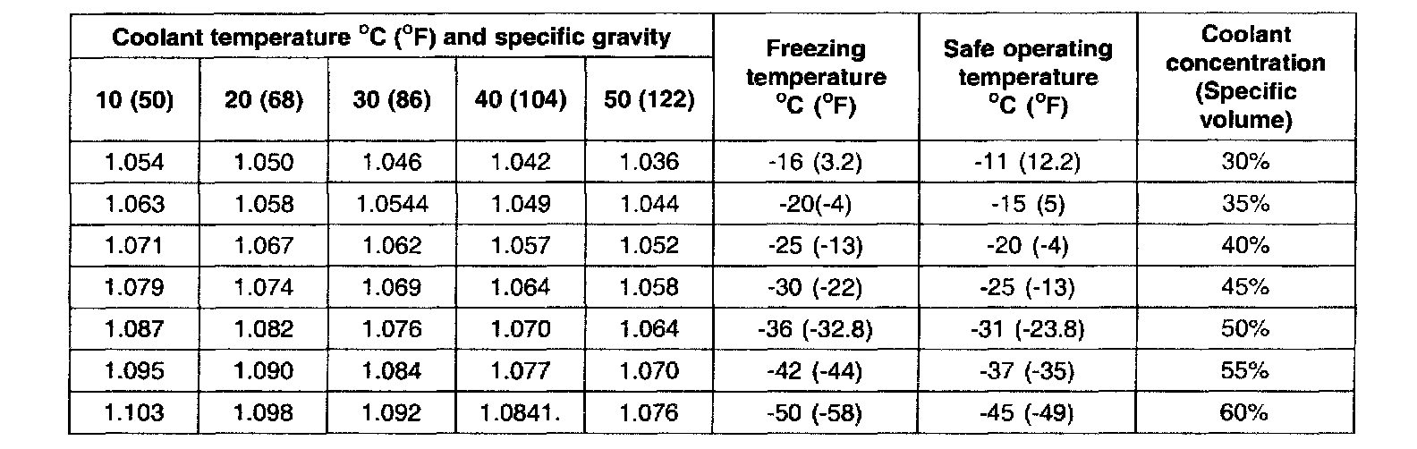 RELATION BETWEEN COOLANT CONCENTRATION AND SPECIFIC GRAVITY