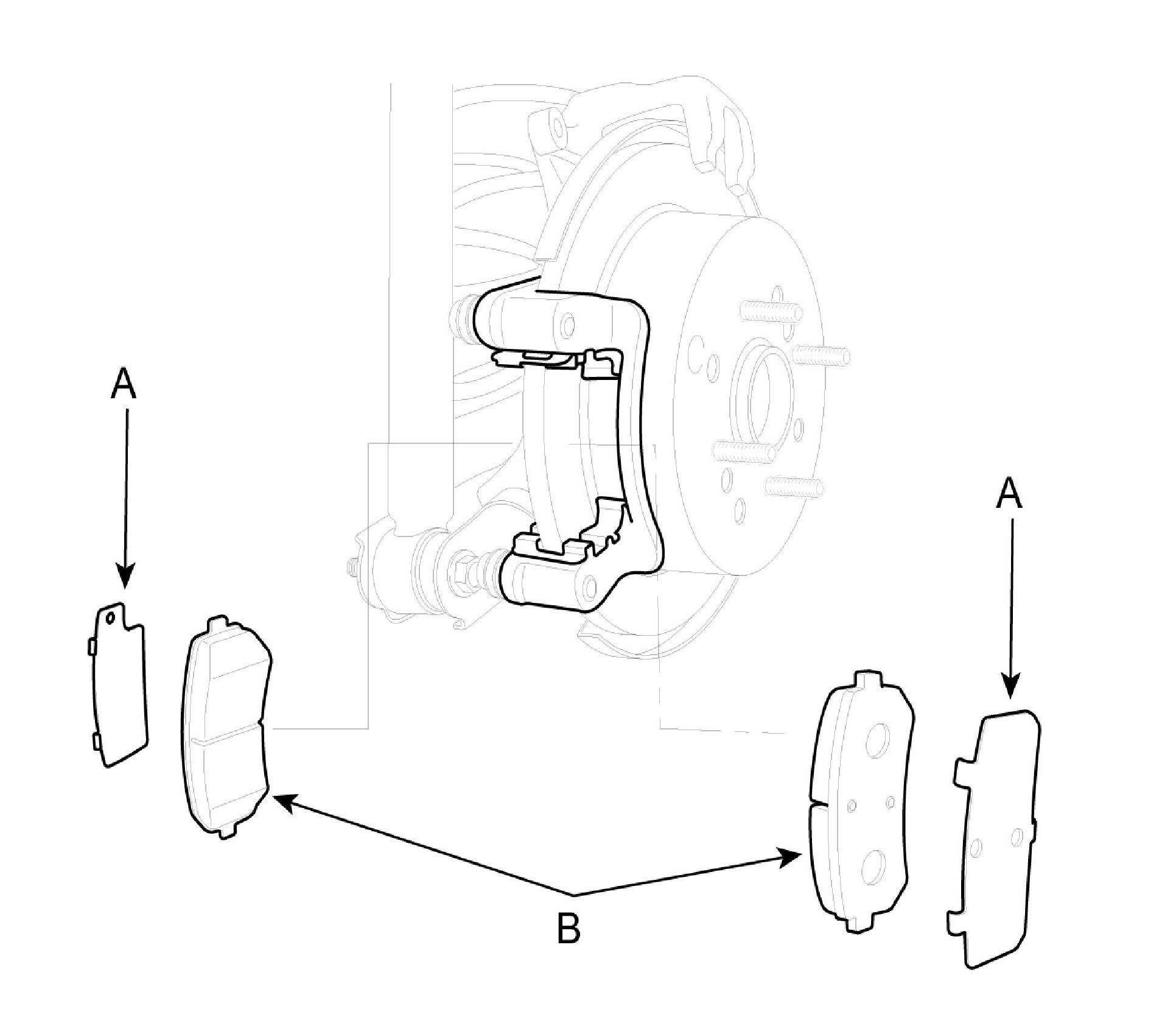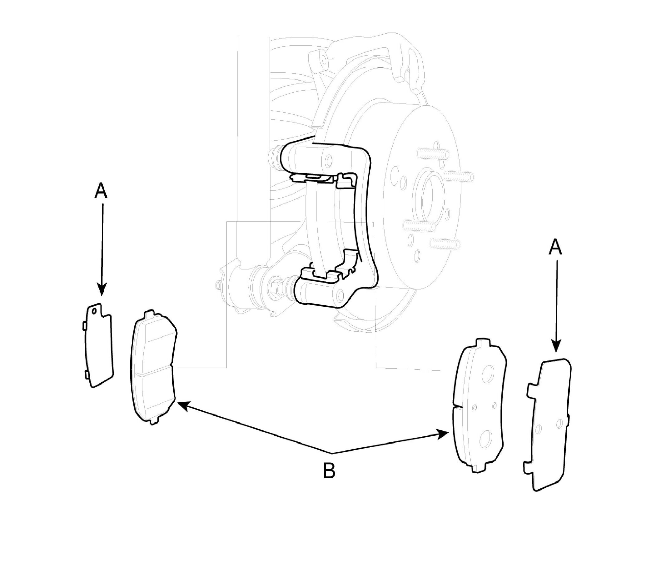 2. Check the foreign material at the pad shim (A) and the back of the pads (B).