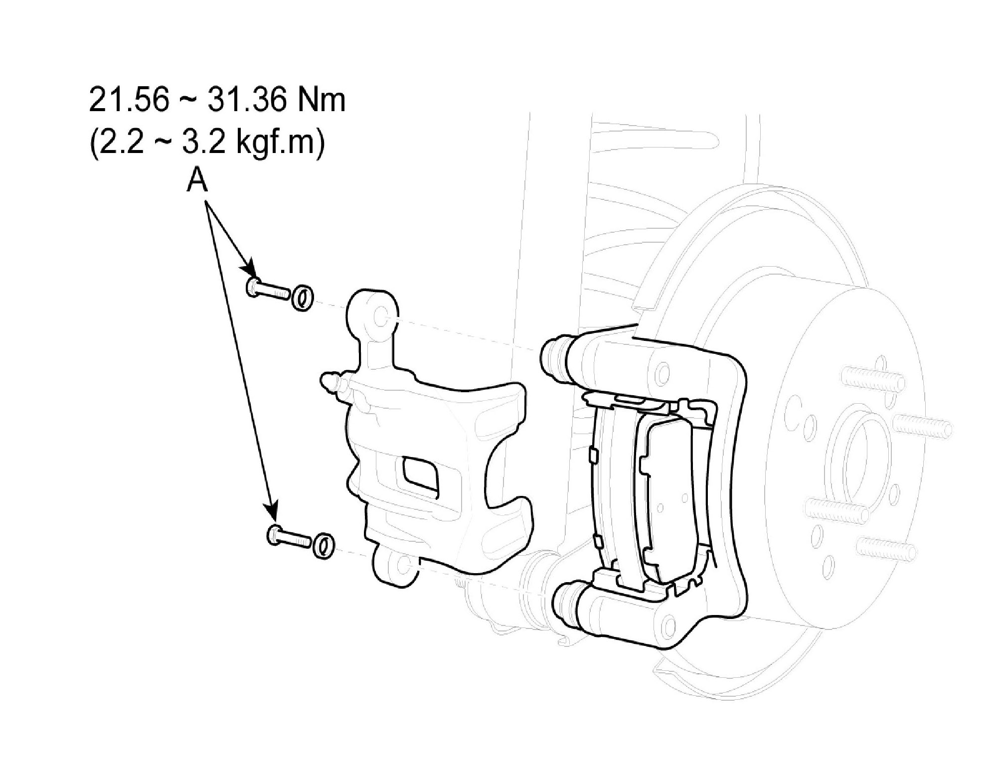 6. Pivot caliper down into position. Being careful not to damage the pin boot, install the guide rod bolt (A) and tighten it to the specified torque.