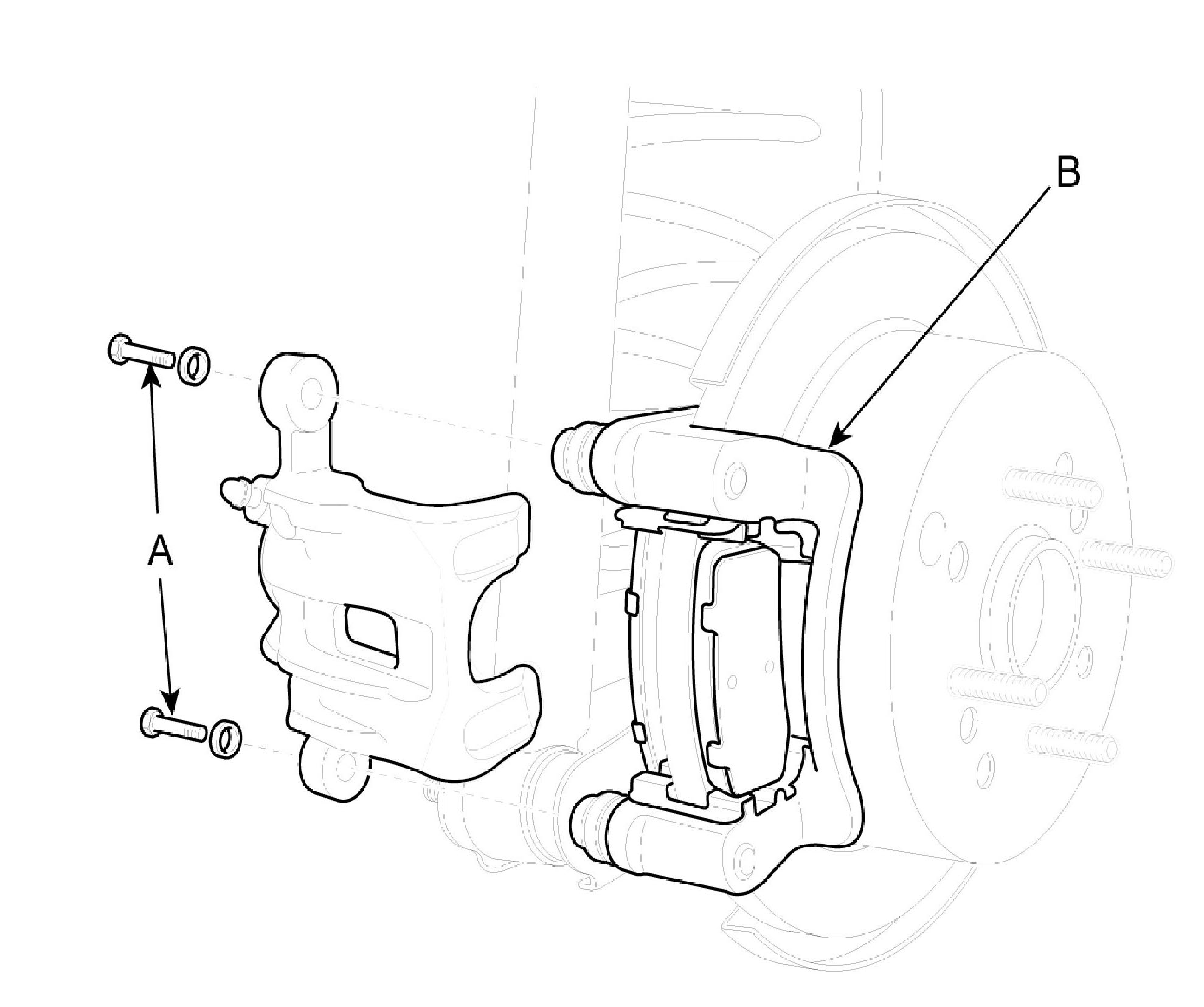 3. Remove the guide rod bolt (A). After, raise the caliper assembly (B), and support it with a wire.