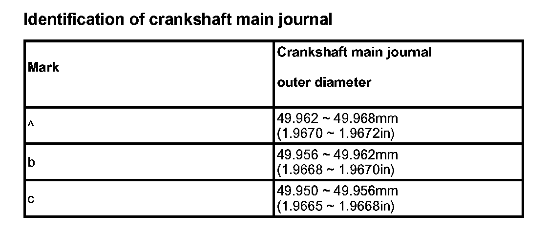 Main journal diameter: 49.950 - 49.968 mm (1.9665 - 1.9672 in)