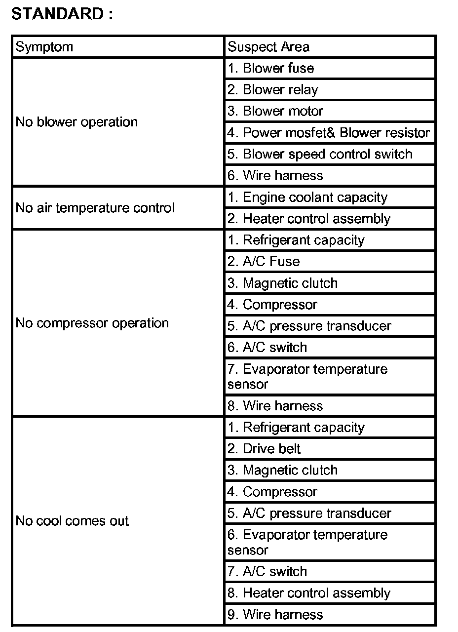 Before replacing or repairing air conditioning components, first determine if the malfunction is due to the refrigerant charge, air flow or compressor. Use the table to help you find the cause of the problem. The numbers indicate the priority of the likely cause of the problem. Check each part in order. If necessary, replace these parts. After correcting the malfunction, check the complete system to ensure that performance is satisfactory.
