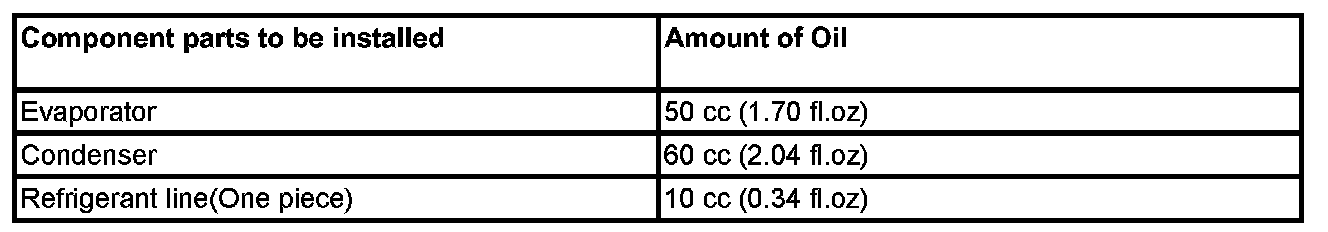 2. Compressor (PAG) oil varies according to compressor model. Be sure to use oil specified for the model of compressor.