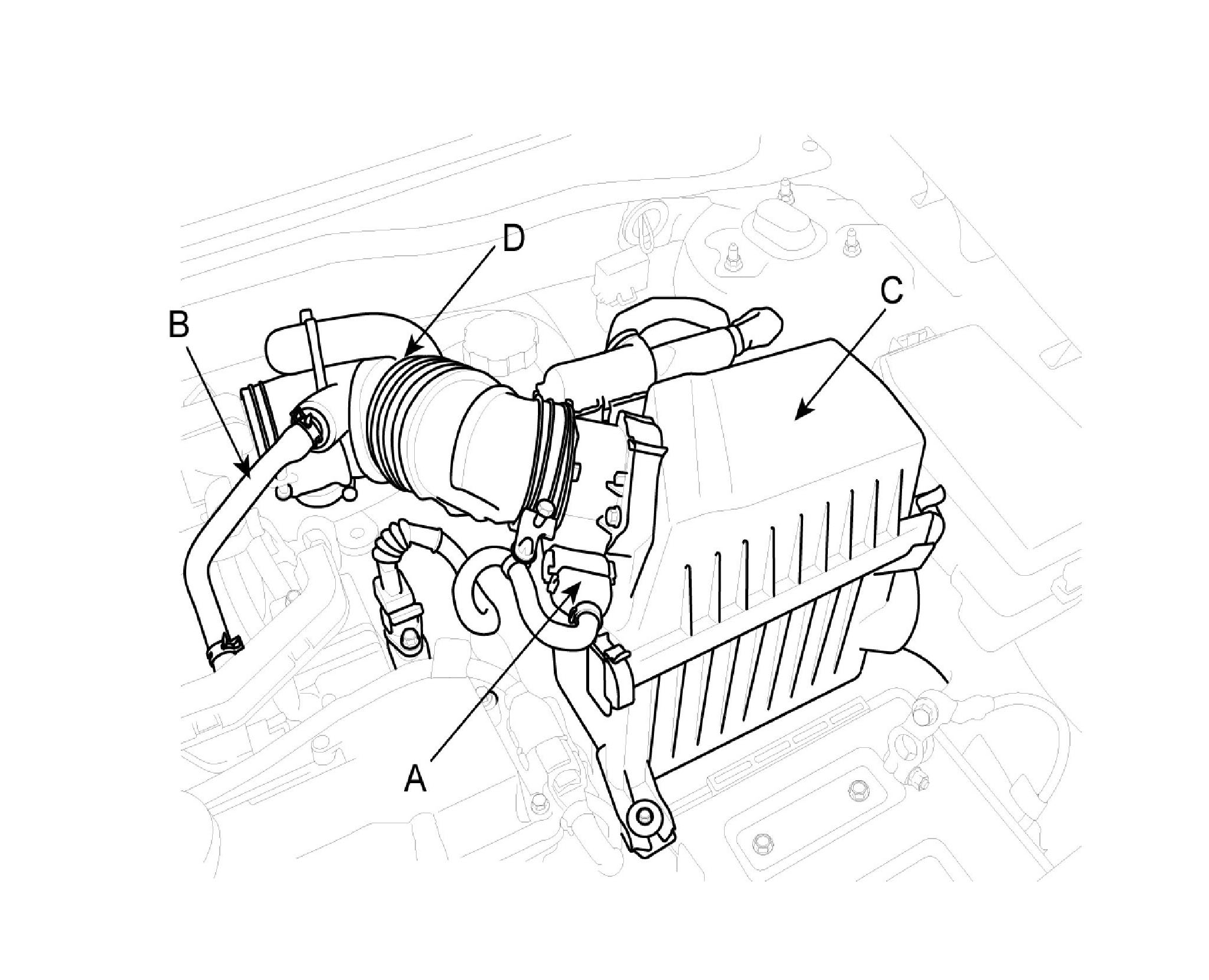 D. Connect the air cleaner hose (D) from the bleeder hose (B).