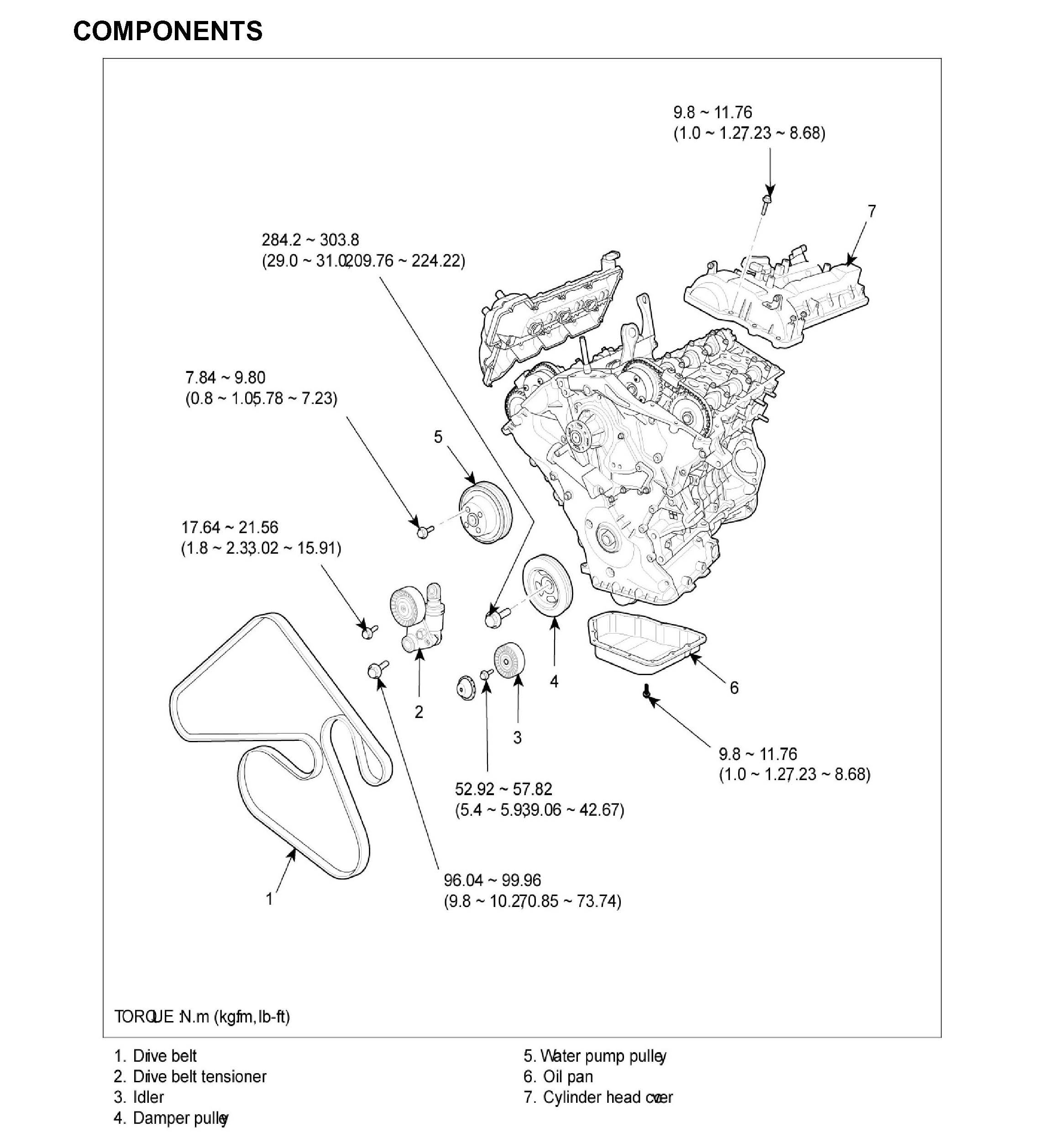 Tightening torque 96.04 - 99.96 Nm (9.8 10.2 kgf.m, 70.85 - 73.74 ft. lbs.) 17.64 - 21.56 Nm (1.8 - 2.2 kgf.m, 13.02 - 15.91 ft. lbs.)