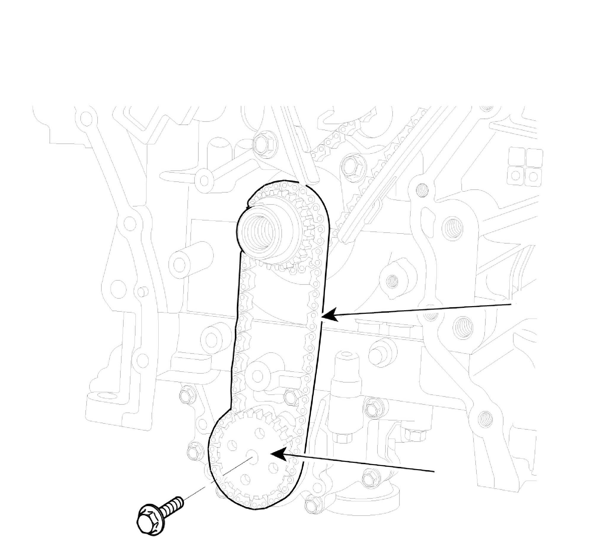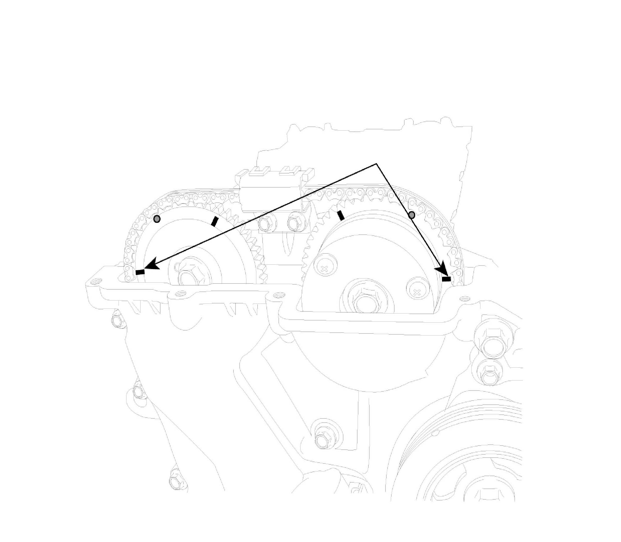 ^ The dowel pins on the cylinder block and holes on the timing chain cover should be used as a reference in order to assemble the timing chain cover to be in exact position.