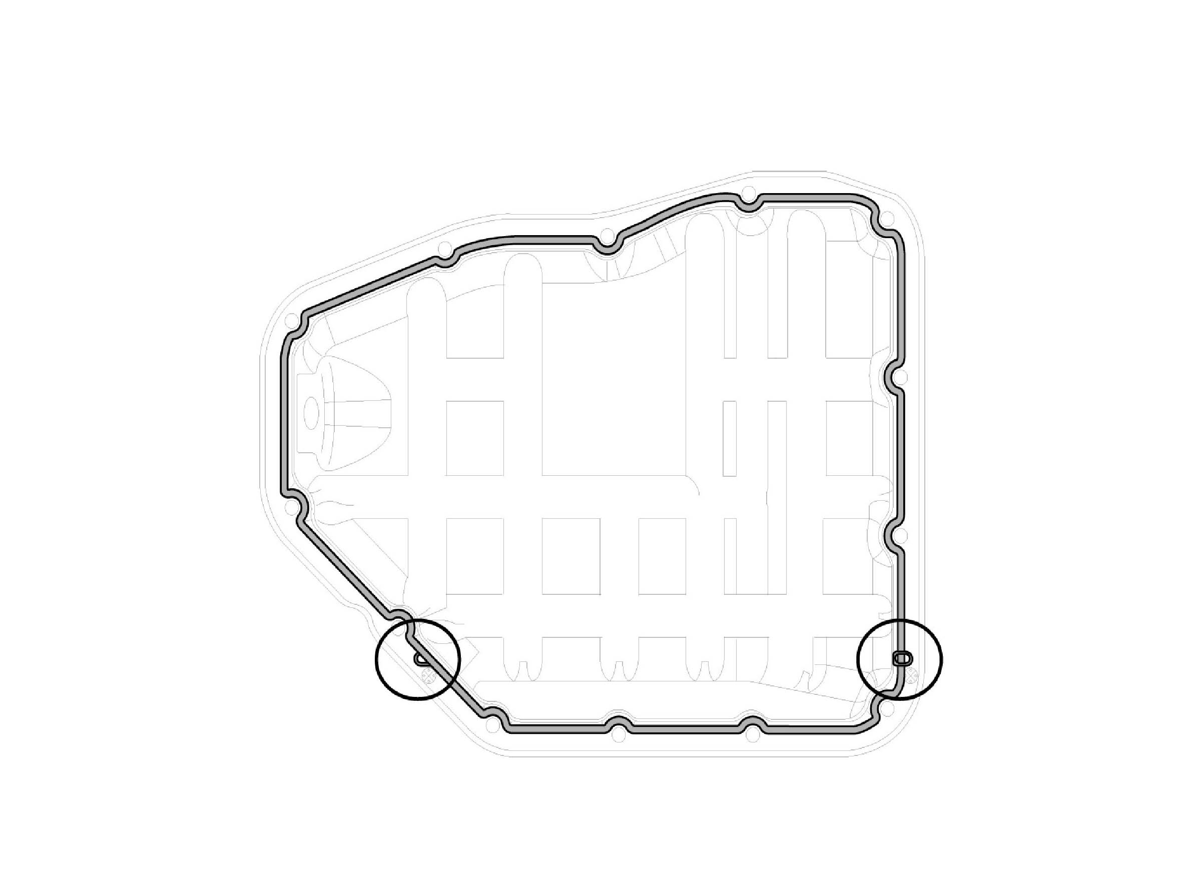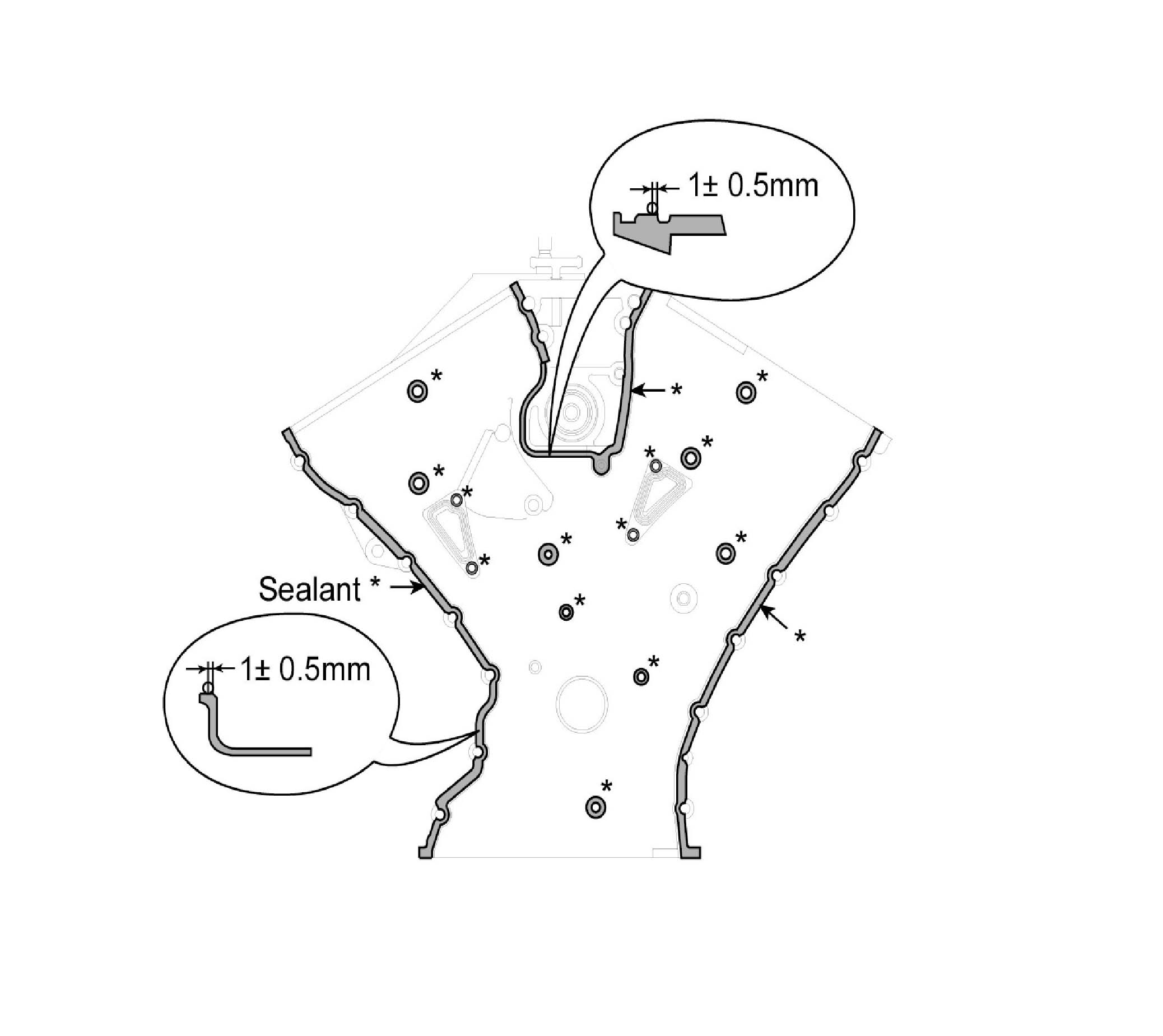 ^ Before assembling the oil pan, the liquid sealant TB1217H should be applied on oil pan. The part must be assembled within 5 minutes after the sealant was applied. Bead width: 2.5 mm (0.1 in.). But marked area (*) to be 5.0 mm (0.2 in.)