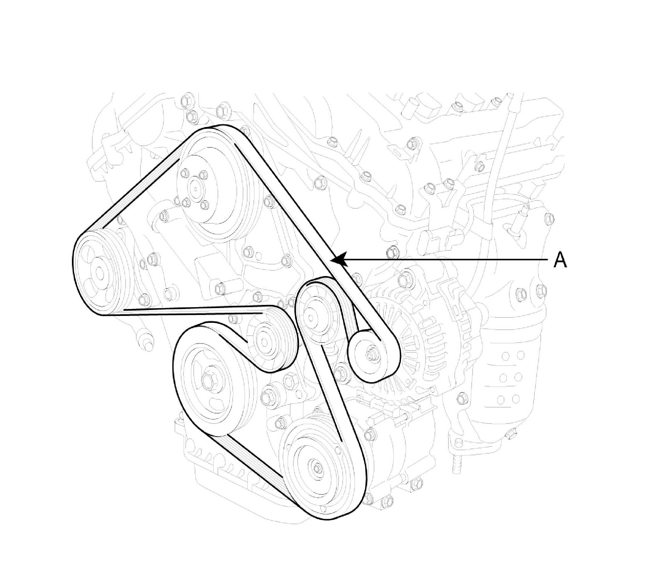 8. Install drive belt (A). Crankshaft pulley -> A/C pulley -> idler pulley -> alternator pulley -> water pump pulley -> P/S pump pulley -> tensioner pulley. Rotate auto tensioner arm in the counter-clockwise direction while moving auto tensioner pulley bolt with wrench. After putting belt on auto tensioner pulley, release the auto tensioner pulley slowly.